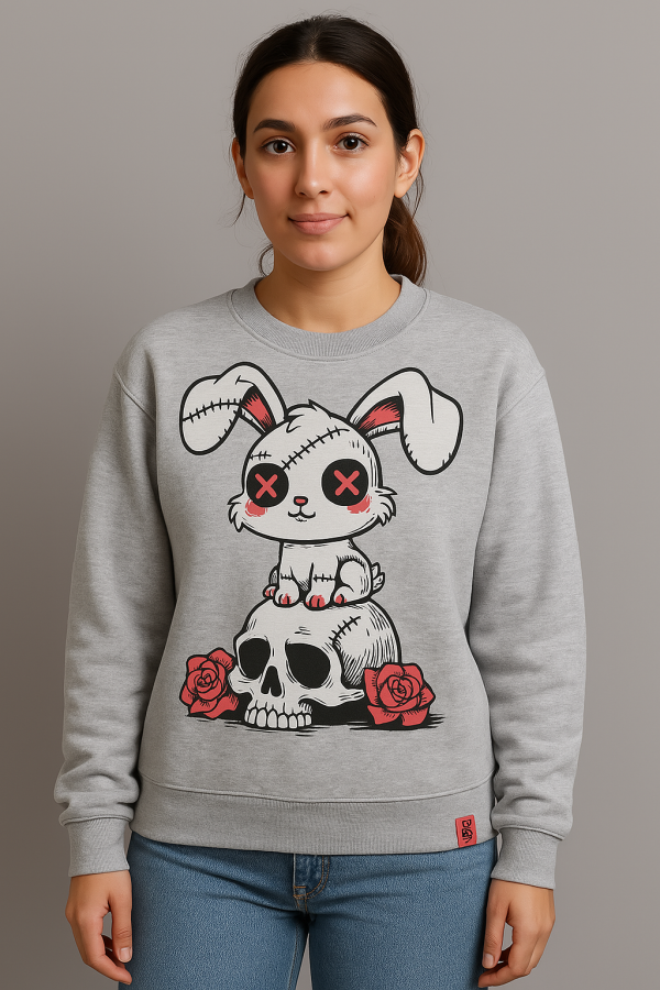 Điểm nổi bật nhất của Sweater Rabbit Gray là hình ảnh chú thỏ Mad Bunny với đôi mắt đỏ hình chữ X, đôi tai to tướng và cơ thể đầy những đường khâu như búp bê voodoo. Mad Bunny ngồi trên một chiếc đầu lâu trắng được tô điểm bằng hai bông hoa hồng đỏ rực. Sự kết hợp giữa hình ảnh ngây thơ và yếu tố gothic tạo nên một thiết kế lạ mắt, thu hút mọi ánh nhìn.